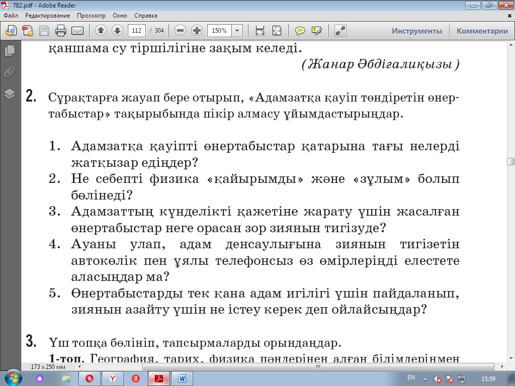 №2-тапсырма. Сұрақтарға жауап бере отырып, «Адамзатқа қауіп төндіретін өнертабыстар» тақырыбында пікір алмасу ұйымдастырыңдар. |
