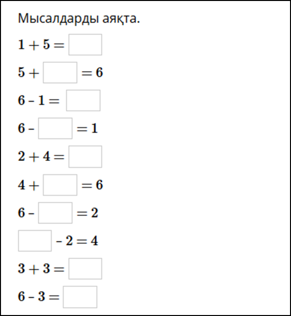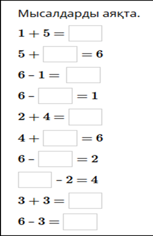 салыстыр. 6=6 (ұл мен қыз) 2) Мысалдар құрастыр. Есепте. 1+4=5 1+2=3 2+2=4 3+3=6 ЕБҚ оқушыға: 10 саны көлемінде кері сана. 6 санының орнын тап 1 2 3 4 5 6 7 8 9 10 10 9 8 7 6 5 4 3 2 1 Сергіту сәтінде «Үйретеді» әнін қосады. (Ж) 2- тапсырма «Ойлан,