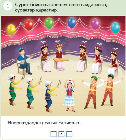 (Ұ) 1- тапсырмада «Ауызша жаттығу» жүзеге асады. 1) Сурет бойынша «неше» сөзін пайдаланып, сұрақтар құрастыр. Өнерпаздардың санын