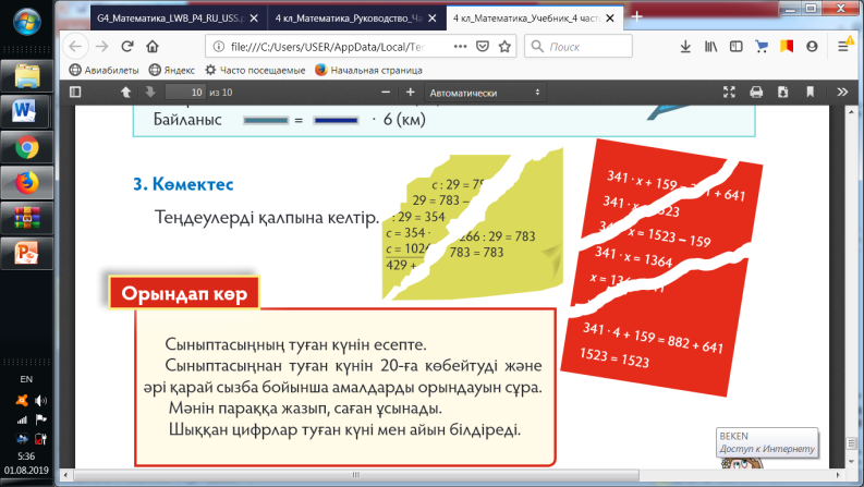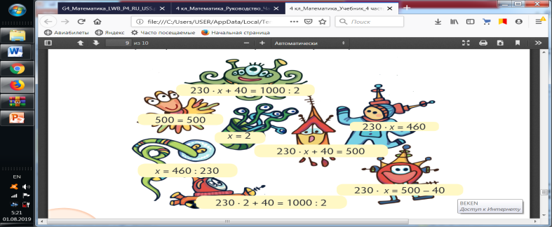 39 + 490 : k = 46; 230 ×а +40=1000:2 түріндегі теңдеулерді шешеді. |