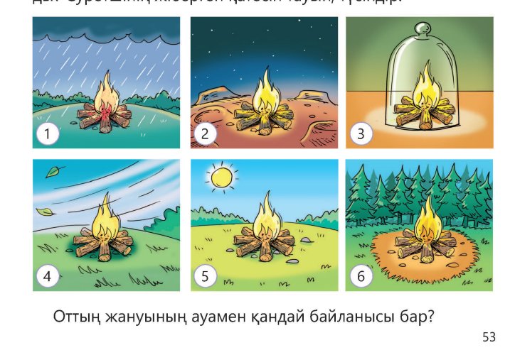 (6-сурет): Суреттегі қателер: 1-сурет: Жаңбыр кезінде от жануы қиын, бұл қате. 3-сурет: Әйнек қақпақ астында от жанбайды, бұл оттегі жетіспегендіктен дұрыс көрсетілген. 4-сурет: Желде отты бақылаусыз жағу қауіпті, бұл қауіпсіздік ережелерін бұзады. 6-сурет: Орманда абайсыз жағылған от үлкен өртке әкелуі мүмкін. Қорытынды: От жақсы жану үшін құрғақ ауа, жеткілікті оттегі және тыныш орта қажет. Жауын-шашын, жел немесе оттегі жетіспеушілігі оттың жануына кедергі болады. Орманда немесе желде от жаққанда сақ болу өте маңызды. |