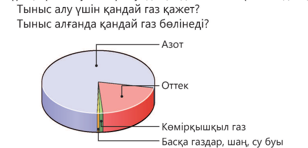 Диаграманың көмегімен ауаның құрамын анықта. Сұрақтарға жауап бер. Ауада қандай зат көбірек кездеседі? Тыныс алу үшін қандай газ қажет? Тыныс алғанда қандай газ бөлінеді?