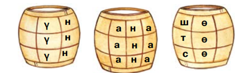 «Бөшкедегі сөздер» ойыны 3-жаттығу. Бос торкөздерге керекті әріпті қойып оқы. Осы сөздердің ішінен өзің қалаған бір сөзден сөйлем құрап жаз. Күн шықты. Шанамен сырғанадық