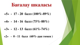 Сабаққа дайындық Өткенді пысықтау Жаңа тақырып Оқулықтан тыс тест тапсырмалары 1.Мұнай өндіретін қай қала? А) Өскемен В) Семей С) Атырау Д) Ақтау 2 Полиметалл кені мол жер қайсы? А) Шымкент В) Алтай С) Талдықорған Д) Кентау А) Сода, хлор В) хлор, бор С) сода, әктас Д) құм, хлор А) бу, қар, су. В) мұз, бу, су С) қар, нөсер, мұз Д) жаңбыр, бұршақ, су А) Жайық В) Сарысу С) Ертіс Д) Сарыағаш А) Сырдария В) Жайық С) Каспий Д) Еділ 7 Ауа қоспасында ең көп газды ата А) көмірқышқыл В) оттегі С) азот Д) азон 8 Жауын-шашын аз жауатын жерлер: А) Алтай тауы өңірі В) Алматы облысы С) Арал теңізі маңы Д) Каспий теңізі маңы А) қалың тұман В) қатты желден С) тығыз газдан Д) аспанға көтерілген будан А) бидай В) ботагөз С) күреңот Д) тары А) Бұғы В) Сиыр С) марал Д) Ақ бөкен А) Суыр В) сүр келес (кесіртке) С) тиін Д) бақа А) Маңғыстау В) Қарағанды С) Жамбыл Д) Қызылорда 14 Тас көмірдің басты кені қай жерден табылған? А) Көкшетау В) Қарағанды С) Қостанай Д) Қызылорда 15 Жанғыш пайдалы қазбаларға не жатады? А) Мұнай, темір В) тас көмір, қорғасын С) Мұнай, тас көмір Д) мыс, газ 16 Құрылыс материалдарына не жатады? А) құмтас, әктас В) бор, ас тұзы С) саз, фосфарит Д) құм, мыс 17 Адам денесінде қанша пайыз су бар? А) 20 В) 40 С) 80 Д) 100 18 Сарыағаш суының неге пайдасы бар? А) миға, өкпеге В) асқазанға, іш құрылысына С) өкпеге, жұлынға Д) жүрекке, бауырға 19 Өсімдіктер бөліп шығаратын газ қайсы? А) азон В) көмірқышқыл газы С) азот Д) оттегі А) Қызылорда В) Солтүстік Қазақстан С) Жамбыл Д) Оңтүстік Қазақстан Үй тапсырмасы Оқулықтағы тапсырмаларды орындап келу