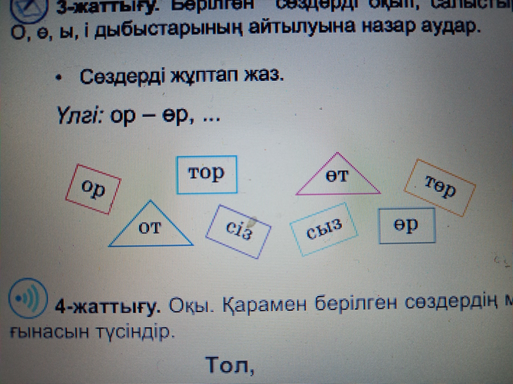 Дескриптор: Ұқсас фигураларды табады Сөздерді жұптап жазады Дескриптор: Өлеңді дұрыс әрі жылдам оқиды. Тол, төл сөздерінің мағыналарын түсіндіреді. Дескриптор: Әріптер мен дыбыстардың арақатынасын белгілей біледі; Жазу кезінде сауаттылықты сақтайды; Орфографиялық нормаларды сақтай біледі. |