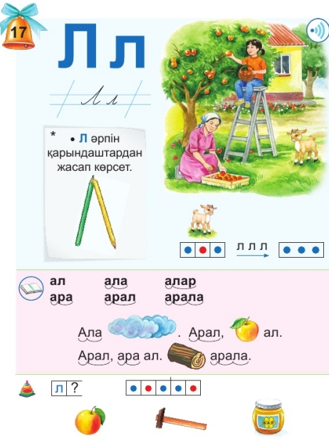 оқыңдар. Ал, ала, алар. Ара, арал, арала. Суретті мәтінді оқыңдар. Ала бұлт, Арал, алма ал. Арал, ара ал. Ағаш арала. - Сызбаның көмегімен сөздерді буындап оқыту. Әр дыбысты бір-бірінен ажырату. Ла, ли, ло, ле, лі, лы Суреттердегі заттарды атаңдар. Сөздің сызба-моделіне сай келетін затты атаңдар. Сергіту сәтінде «Қызыл раушан» әуеніне билеп сергиді 2-тапсырмада өздік жұмыс жүреді. Жазылым 1. Партада дұрыс отырғызады. 2. Жазуға даярлауда бала қолының ұсақ бұлшықеттерін дамытатын жаттығулар жасатады.