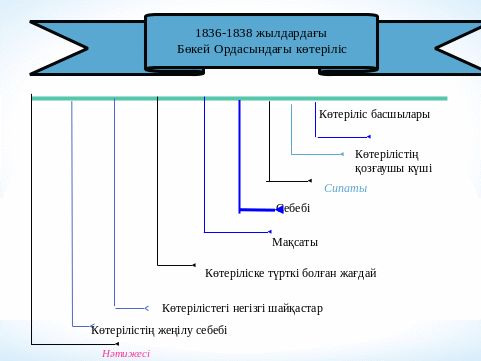 1836-38 жылдардағы Бөкей Ордасындағы шаруалар көтерілісі Сипаты:антифеодалдық Себебі:феодалдардың үстемдігі,Жәңгір хан озбырлығы,салықтың көптігі,бекіністердің салынуы Мақсаты:Хан озбырлығына шек қою,отаршылдық саясатты өзгерту, шаруалардың жағдайын жақсарту. Көтеріліске түрткі болған жағдай:1833 жылы Жәңгір ханның қайын атасы Қарауылқожа Бабажанұлын Каспий өңіріне билеуші етіп тағайындауы Көтерілістің жеңілу себебі:Үстем тап өкілдерінің опасыздығы,көтеріліс басшыларының көтерілісшілерді біріктіре алмауы,қару-жарақтың теңсіздігі,стихиялылығы,ұйымшылдықтың жеткіліксіздігі Нәтижесі:салық мөлшеріне шек қойылды,хандық билік әлсіреді,патша үкіметінің старшындармен санасуына тура келді. 2.«Ол кім,бұл не?» ойыны Оқушылар есімдер мен атауларға түсіндірме жасайды.