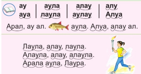 Дыбыстық талдау жасайды. Әріптің сұлбасын жасайды. Сурет бойынша сұрақтарға толық сөйлеммен жауап береді. Әңгіме құрайды. Хормен өлең оқып, қимылмен көрсетеді. Партада дұрыс отырады. Жаттығу жасайды. Қалам, қарындашты дұрыс ұстайды. Тапсырма орындайды. Сөздің мағынасын тыңдайды. Сұрақтарға толық сөйлеммен жауап береді, дәлелдейді. Ұйқас сөздерді табады. Сөздерге дыбыстық талдау жасайды |