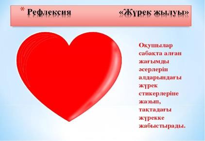 «Жүрек жылуы» әдісі бойынша ой қорытып, сабаққа рефлексия жасайды. |