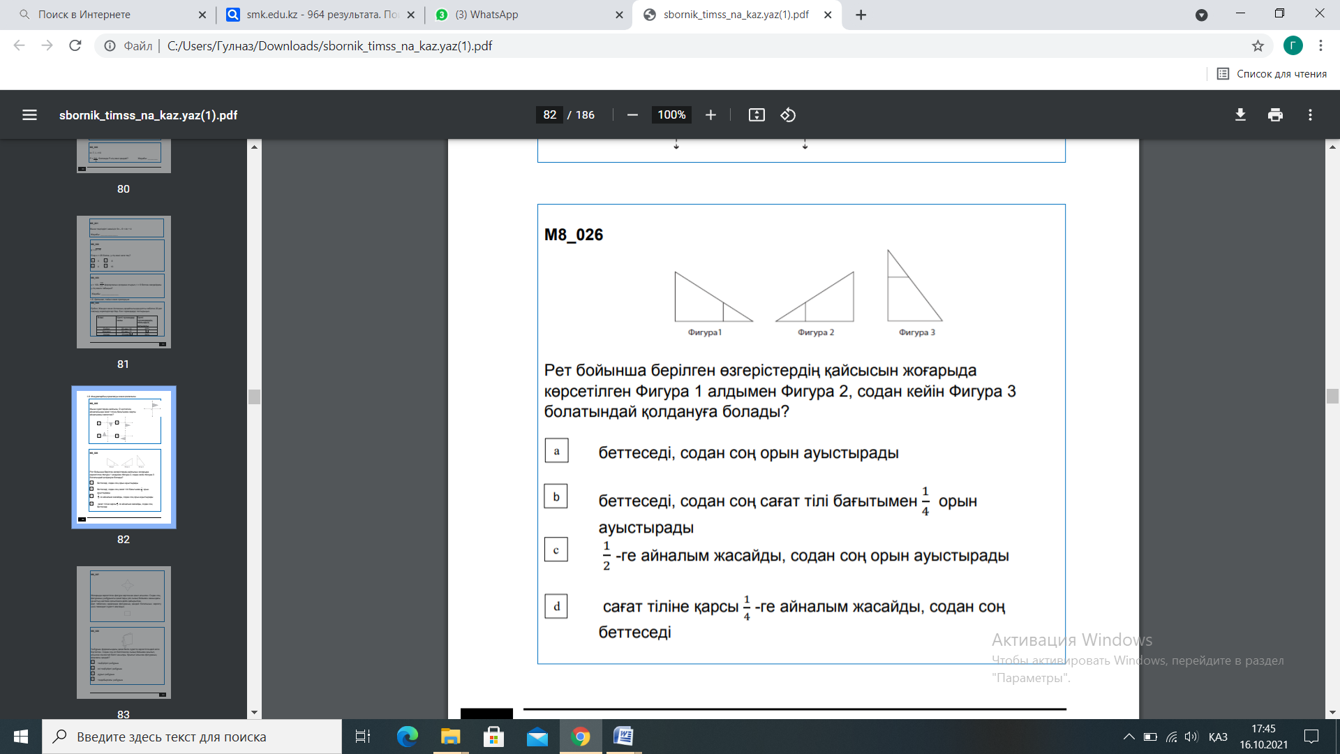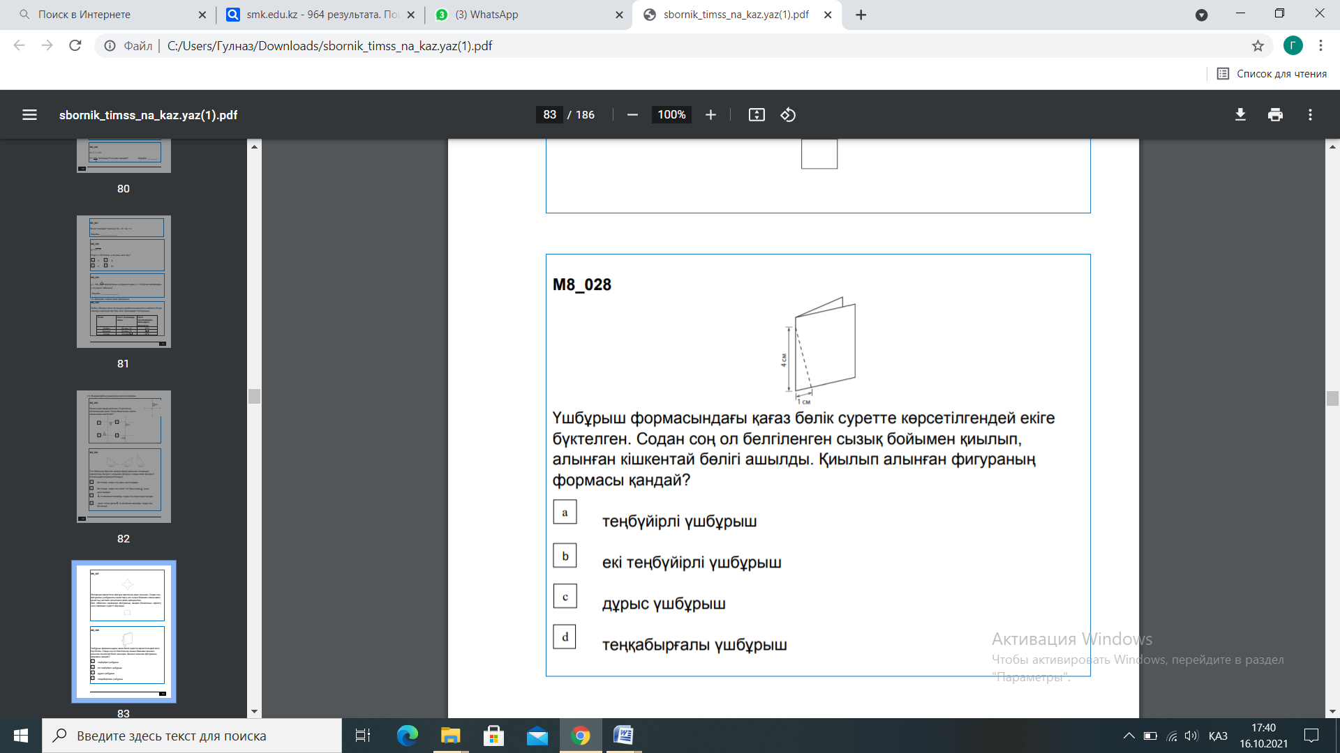 Үшбұрыш формасындағы қағаз бөлік суретте көрсетілгендей екіге бүктетіледі. Содан соң ол белгіленген сызық бойымен қиылып, алынған кішкентай бөлігі ашылады. Қиылып алынған фигураның формасы қандай?