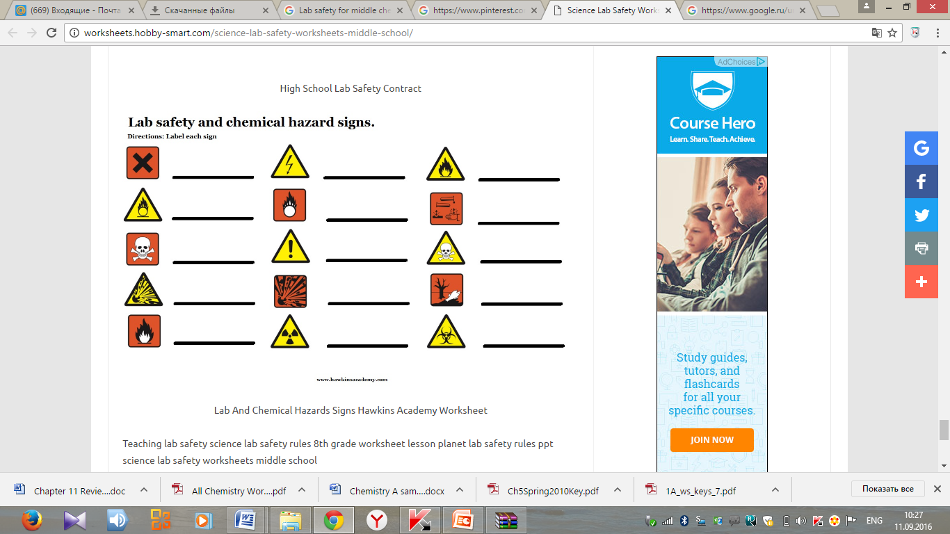 А. В. С. Химия кабинетіндегі жұмыс жасау кезіндегі қауіпсіздік техникасының ережелерін толықтырыңыз. А. Химиялық экспериментті жүргізу алдында ________________________ B. Егер реактивтің әсерінен күйіп қалсаңыз ________________________ C. Артық алынған реактивтің қалғанын қайтадан _______________________ D. Егер газ күйіндегі заттың иісін сезгіңіз келсе ________________________ Лабораторияда тыйым салынатын белгілерді қарастырыңыз. Бұл белгілер қауіптіліктің қай түрін білдіретінін сипаттаңыз.