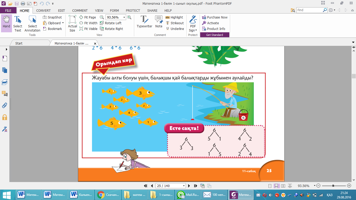 Мектеп сөмкесін жинауға көмектес. Тапсыр-ма көп заттардың ішінен саны біреу ғана болып тұрған затты табуға арналған. Oқушыдан басқа заттарды емес, неге осы затты таңдағанын түсіндіру-ді сұраңыз. Жауабы: күнделiк, қаламсауыт, сызғыш, альбом, қалам, қарындаш. Қатені тап. Берілген тапсырманы орындау үшін жұптық жұмыс ұйымдастырыңыз. Оқушылардан суреттегі қатені табуды сұраңыз. Олар диалог барысында кейбір суреттердегі заттардың саны көрсетілген цифрларға сай келмейтінін табады. Яғни қатені табады және тапсырманы орындайды. Орындап көр. Оқушыларға топпен жұмыс іс-теуді ұсынып, соңынан өздерінің байқағанын топ ішінде қорытындылап, өз пікірін қорғауға мүмкіндік беріңіз. Жауабы: мысал ретінде тақта, есік, компьютер және т.б. алуға болады. Суреттен саны 1-ге тең болатын заттарды тап. Жұппен орындалатын тапсырма. Саны 1-ге тең заттарды тауып атайды. Тексеру барысында кей-бір жұптар жауаптарын атайды, қалғандары кері байланыс үшін тиісті түстегі парақшаны көрсетеді: жасыл түс — дұрыс, қызыл түс — қате. Жауабы: киіз үй, әже, ер адам, құлын, ұл бала, қыз бала, қорап.Гүлдер мен көбелектер саны бірдей ме? Оқушылар суретте көрсетілген әрбір гүлге бір-бір көбелектен келетіндей сәйкестендіріп, жауаптарын парталас көршісімен жұп болып талдайды да, өз пікірін айтады. Жауабы: барлық көбелектерге жетпейді, бір көбелек гүлсіз қалып қояды. Шығарып көр. Арман мен Айнұр қораптан кезек-кезек кәмпит алды. Бірінші кәмпитті Арман, екіншісін Айнұр және т.с.с. алып тауысады. Соңғы кәмпитті кім алады? Кәмпиттің көбі кімге тиеді? Кәмпиттердің орнына қағаздан жасалған дөңге-лектерді пайдаланып, оқулықтағы “Шығарып көр” айдарындағы тапсырманы сыныпта оқушылармен тәжірибе жасай отырып өткізіңіз. Жауабы: Арман соңғы кәмпитті алады. Оған үш кәмпит, ал Айнұрға — екі кәмпит тиеді. |