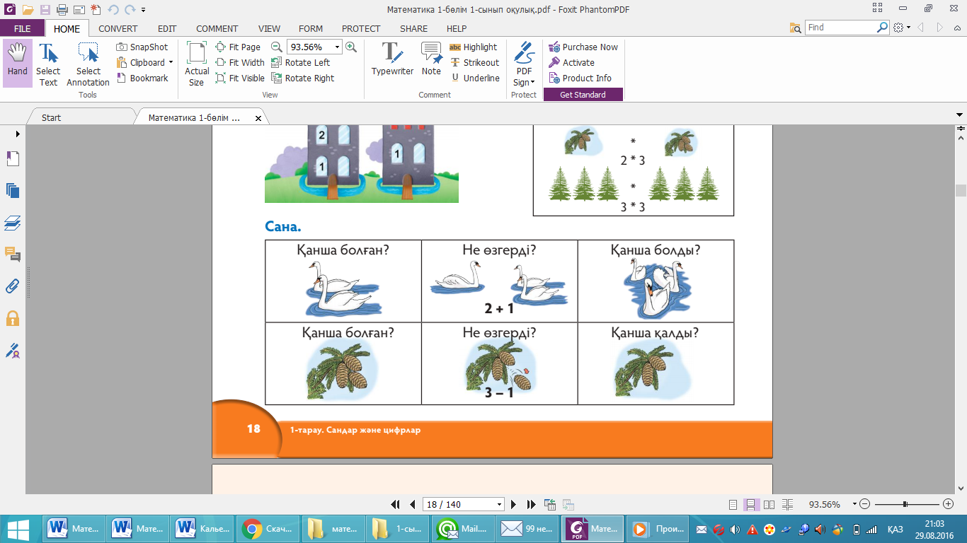 Фигуралардан жұп құрастыр. Оқушылар заттардың екі тобын жалғастырып, фигуралар жұптарын құрастыруы керек. Одан кейін оларды салыстырып, салыстыру нәтижесін суреттердің астына мына белгілерді “=” немесе “≠” пайдаланып жазулары тиіс. Жауабы: а) 6 ≠ 3; ә) 5 ≠ 7; б) 4 ≠ 10. Түсіп қалған сандарды қой. Оқушылар бе-рілген тапсырма бойынша құмырадағы гүлдердің саны тең болатындай етіп суретті өзгертуі тиіс. Олар бір құмырадағы гүлдерді екінші құмырадағы гүлдердің санына тең болатындай етіп толықтырып салады. Немесе олар бір құмырадағы гүлдердің санын екіншідегімен теңестіру үшін бірнешеуін сызып тастайды. Жауабы: бірінші құмыраға 4 гүлді толықтырып салуға немесе екінші құмырадағы 4 гүлді сызып тастауларына да болады. Шаршының саны қанша болса, дөңгелектің де саны сонша болатындай етіп суретті толықтыр. Оқушыларға салыстыру үшін екі шаршы мен бір дөңгелек ұсынылған. Олардың санын теңестіру үшін оқушылар 1 дөңгелекті толықтырып салу керек. Ағаштардағы құстар саны тең болатындай етіп суретті аяқтап сал. Оқушылар екі ағаштағы құстар саны тең болатындай етіп, қай ағаштағы құстарды толықтыру керектігін өз беттерінше табуы керек. Жауабы: екінші ағашқа бір құсты толықтырып салу керек. |