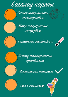Оқушылар әр кезеңде парақшаларын толтырады Дескриптор; Сұрақтарға дұырс жауап береді; ҚБ: Тамаша! Дескриптор: Ортақ қасиетін көрсетеді; ҚБ: Тамаша! Дескриптор: Жылытқыш құралдарын көрсетеді; ҚБ: Өте жақсы! Дескриптор: Әр елді өңірдің үй жылыту құбылысына тоқталады; ҚБ: Керемет! Дескриптор: Бөлме температурасын зерттейді; ҚБ: Жарайсың Дескриптор: Сұрақтарға дұрыс жауап береді; ҚБ: Өте жақсы! |