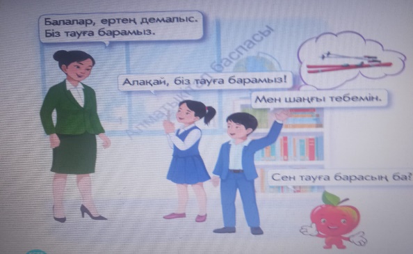 ІІ. Фонетикалық жаттығулар 1.Тыңдалым Прилетела ворона – қарға в лес и кричит: «Қар- қар-қар. Қар аппақ! Қар аппақ! Қыс суық!» Услышав ворону, все звери в лесу начали утеплять свои жилища, запасаться пищей и стали благодарить ее: «Жарайсың, қарға! Ққ әріпі передает звук [ қ ] - [ қ ] - [ қ ] Буындарды оқу [ қа ] - [ кә ] [ қо ] – [ кө ] [ құ ] - [ кү ] Жаттығуға алынған сөздер: Буындап оқу қар-ға қар ап-пақ қыс су-ық Қ тағы қандай сөздерде кездеседі? 2.Жазылым №2 жазу дәптерімен жұмыс 3.Жаңа сөздермен таныстыру Жаңа сөздер: Ертең –завтра Демалыс – выходной демалыста –в выходной день Біз-мы барамыз – пойдём тауда- на горе Шаңғы- лыжи Тебемін-катаюсь Алақай! – Ура! 4. Адасқан жалғаулар Сөздерге қажетті жалғауларды қосу: Мен бара ... . Сен бара ... . Ол бара ... . Біз бара ... . (Қажетті жалғаулар: -сың, -мын, - мыз, -ды) 5. Оқылым. Мұғалім оқушылардың назарын оқулықтағы 1-тапсырмада берілген суретке аударады. Сурет бойынша сөйлемдерді оқиды.