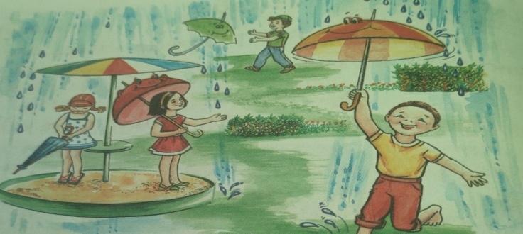 Саған қандай ауа райы ұнайды? Суреттерде табиғат пен ауа райының қандай құбылыстары бейнеленген? Тыңдаған музыкаң суреттердің қайсысына жақын? 2-тапсырма.Орындау. Жаңбыр.( ағылшын әні) Өлеңін жазған:Т.Тоқжанов Жаңбыр,жаумай, тоқтай тұр, Айналаңа қарай тұр. Асан доппен ойнасын, Үсті су боп қалмасын.
