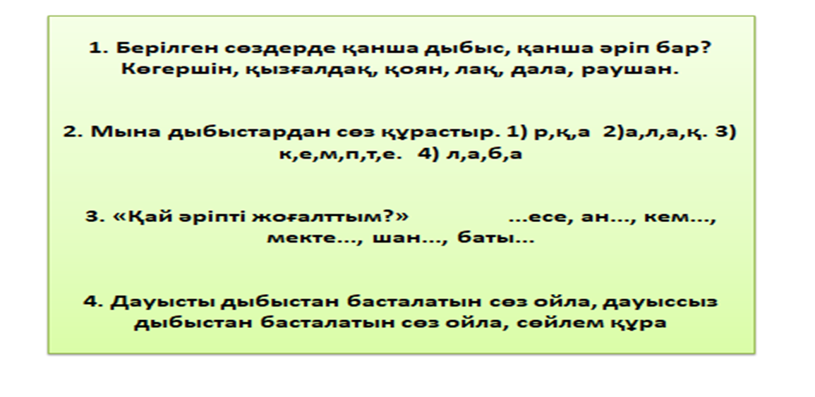 Амандасып алады Әліппе кезеңін пысықтайды Әр топ өз атауына байланысты тапсырманы орындайды Ойын ойнай отырып, дыбыстарды еске түсіреді Орындыққа отырып өлеңді мәнерлеп оқиды Бір біріне микрофон ұсынып сұраққа жауап алады Өз ойын айтады Дыбыстық талдау жасайды Дәптермен және тақтамен жұмыс жасайды Жаттығу жасайды Суретке қарап мәтін құрайды Саралау тапсырмасын орындайды Кері байланыс жасайды |