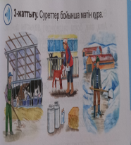 ФС тапсырмасы 2-жаттығу. Суретпен жұмыс жүргізіледі. Мұғалім мұнда қыс мезгілі екеніне, қыста жануарлар мен құстардың тіршілігінде қандай өзгерістер болатынына, адамдар тарапынан оларға жасалатын қамқорлыққа жетекші сұрақтар қоя отырып, алға жетелейді