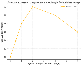 Ауксин концентрациясының өсімдік биіктігіне әсері 3. Неліктен 4.0 мг/л-ден жоғары концентрацияда өсімдік биіктігі төмендей бастады? Ауксиннің жоғары концентрациясы өсімдіктің өсуін тежеуі мүмкін, себебі шамадан тыс гормон жасушалардың бөлінуін және ұзаруын ретсіз түрде арттырып, құрылымдық әлсіздікке немесе өсу қарқынының баяулауына әкеледі. Бұл өсімдіктің биіктігін төмендетуі мүмкін. |