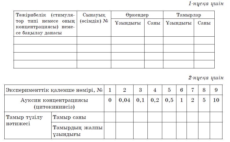 Зертханалық жұмыстың тақырыбы мен мақсатын жазады. Ауксин (немесе гормондар қоспасы) әсеріне ұшыраған және бақылау өсімдігінің вегетативті мүшелерінің жағдайын бағалайды. Ұзындығын өлшеп, тәжірибе кезінде түзілген өркендер мен тамырларды санайды. Мәліметтерді берілген кестелердің біріне жазады. Қандай стимуляторлар немесе олардың қандай концентрациясында едәуір дамыған вегетативті мүшелер түзілгенін көрсетеді. Фитогормондардың әсерінің тиімділігі туралы қорытынды жасайды. |