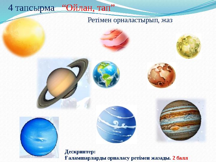 3-тапсырма Түрлі ақпарат көздерін пайдаланып, әрбір ғаламшардың ерекшелігін біліп ал. Деректерді кестеге енгіз. Бірлескен жұмыс ЕБҚ және ЕҚБ Өз ғаламшарыңды «ойлап тап». Оны сипатта. – Сенің ғаламшарың қалай аталады? – Ол несімен ерекше? – Оның үстіңгі беті қандай? – Сенің ғаламшарыңда тіршілік бар ма? Үй тапсырмасы Күн жүйесінің моделін жеміс-жидектерден жаса. Мысалы, жүзім – Меркурий. Басқа ғаламшарларды бейнелеу үшін қандай жемістерді таңдайсың? ҚЖ: Жер тобы ғаламшарларының суреттерін салып, олар туралы айт.