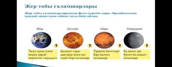 Тамаша! Жарайсыңдар! Дескриптор: Түрлі ақпарат көздерін пайдаланып, әрбір ғаламшардың ерекшелігін біледі-1б