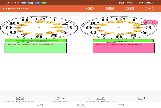 Қатысып отырған оқушыларды мадақтап қою. Дескриптор: Галареядағы суреттерді таңдап тапсырманы орындайды Сағат түрлеріне түсіндірме жасайды Дескриптор: Уақытты өлшеу үшін тәжірибе жасайды Бір-бірінің қозғалыс уақытын анықтайды Тамаша!