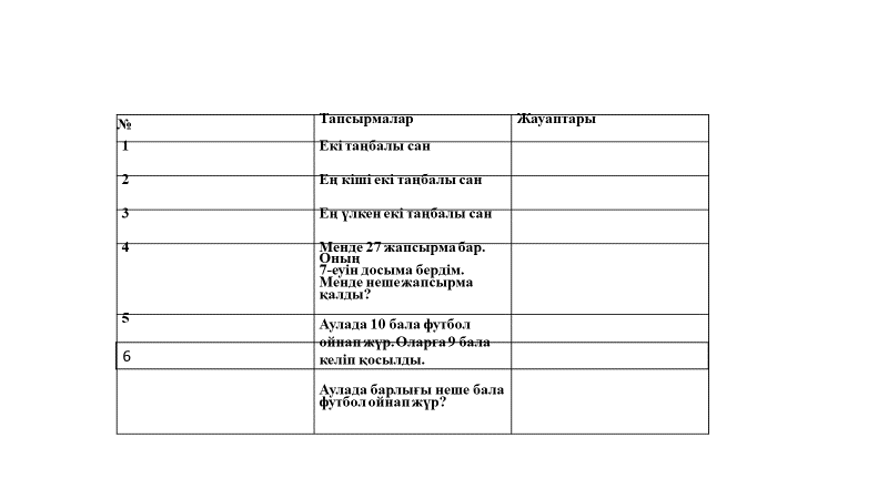 2.5.1.1. Бір-екі амалмен орындалатын есепті кесте,сызба,қысқаша жазба түрінде модельдеу. 2.5.1.8. Барлық арифметикалық амалдарға берілген жай есептердің шешуін санды өрнектер және теңдеулер түрінде модельдеу. |