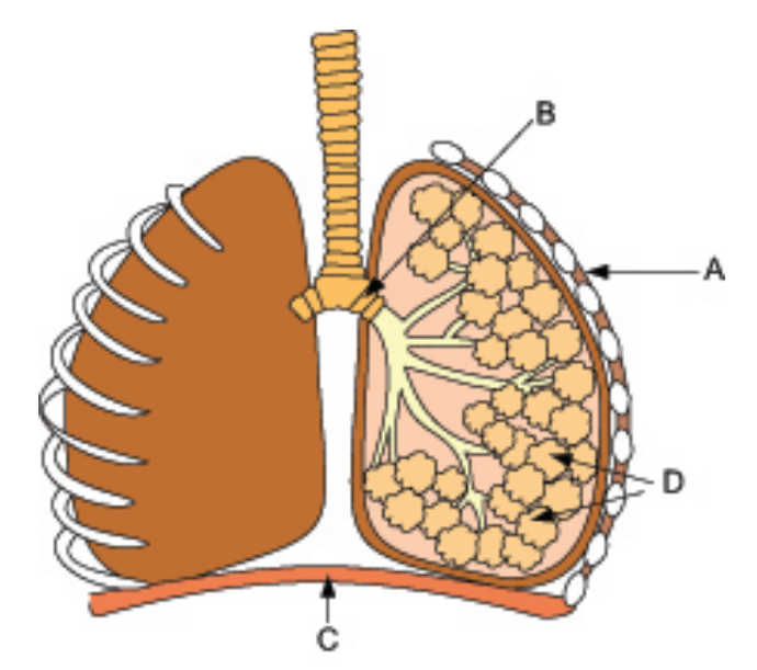 Кілт сөздер: мұрын қуысы (кеңсірік); жұтқыншақ; көмей; көмекей; кеңірдек; оң жақ өкпе; бронхылар; сол жақ өкпе; қабырғааралық бұлшық еттер; кеңірдектің жартылай шеміршекті сақинасы; қабырға; көкет.