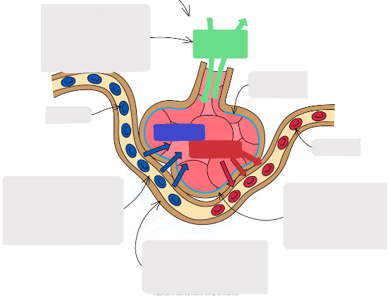Кілт сөздер: ауа кіру және шығу жолы, ылғал қабаты, төмен CO2 , жоғары CO2, жоғары O2 , бір жасушадан тұратын альвеолааралық қабырға (қысқа диффузиялық арақашықтық береді), төмен O2 ,желдету CO2 және O2 үшін керек концентрация градиентін жасайды, қанмен жақсы қамтамасыз СО2 және O₂ үшін күшті концентрация градиентін жасайды, бір жасуша жуан капилляр қабырғасы (қысқа диффузиялық арақашықтық береді) |