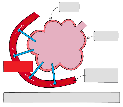 Кілт сөздер: альвеоларлы қабық, қан ағысы, төмен концентрациялы 02 , жоғары 02 концентрациясы, 02 қаныққан қан, қан капиллярлары (жұқа, өткізген қабырғалары), қанда O₂ төмен концентрациясы сақталады, өйткені қан оттекті альвеолааралық қабықтан алыстатып тасып отыр. |