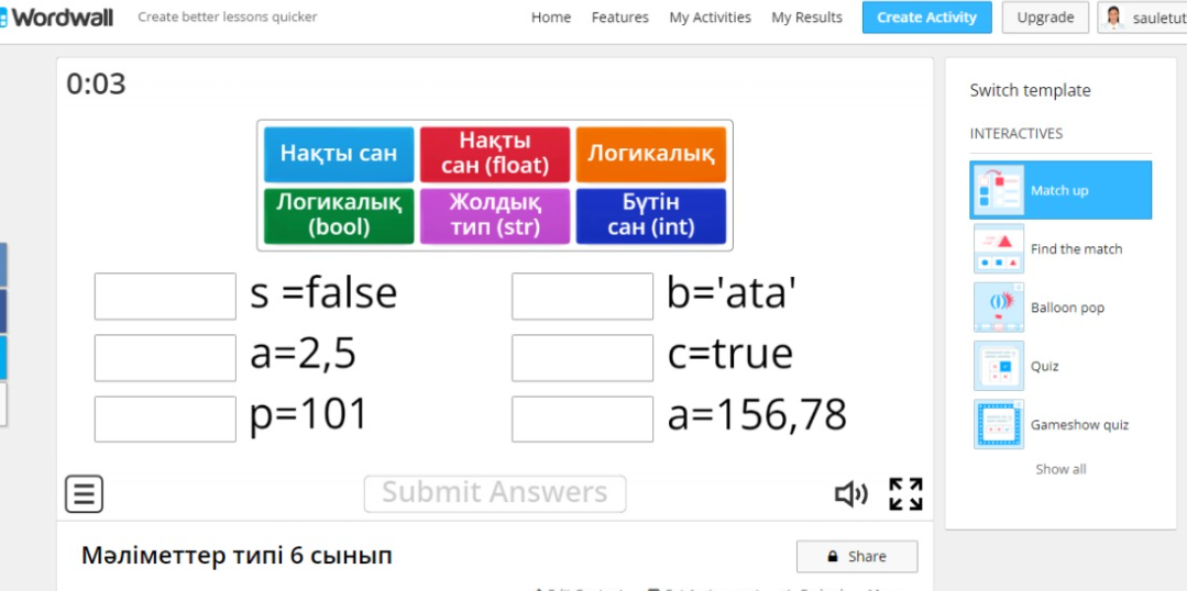 Практикалық тапсырмалар Жеке жұмыс. А деңгейі Қарапайым сәлемдесу программасын жазайық. Salem, Taldykorgan сөзін экранға шығарыңыз. В деңгейі Дайын программа берілген, осының нәтижесінен мәліметтердің типтерін анықтап, түсіндіріңіздер print(12 + int('8')) print(str(2.4) + '29') print(int(4.5) + 5) print(float('1.5') + 5) С деңгейі (ФС) Сынып бөлмесінің ұзындығы (а) және ені (b) берілген. Осы бөлменің периметрі (P) мен ауданын (S) есептейтін сызықтық программа құр. Қорытындылау Wordwall.net платформасында сәйкестендіру тапсырмаларын орындау
