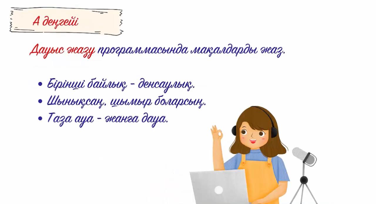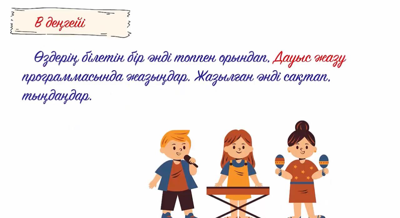 - Компьютерде дыбыс жазбаларын жазу программаларымен танысады. |