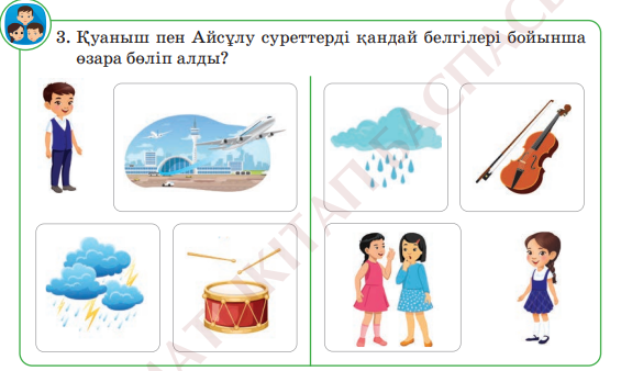 ҚБ 2 тапсырма. Жұптық жұмыс. «Суреттер сөйлейді » әдісі ОДД :білу,түсіну,қолдану Qr код арқылы тыңдалым Нұсқау: Суретке қара. Қуанышпен Айсұлу суреттерді қандай белгілері бойынша өзара бөліп алды?