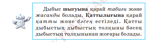 Бағалау критерийі Дыбыс қаттылығы бойынша дыбыс көздерін жіктейді Дескриптор Дыбыстың қаттылығы туралы біледі 3 балл |