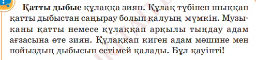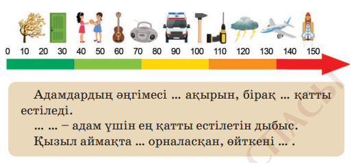 Тəжірибе жүргізеді. 1) Дыбыс көзіне неғұрлым жақын болсаң, соғұрлым ол қатты естіледі. 2) Дене дыбысының қаттылығы оны жасау үшін қолданылған затқа байланысты. 3) Затты неғұрлым қатты ұрсаң, соғұрлым дыбыс қатты шығады. 4) Дыбыстың қаттылығы оның құрылымына байланысты. Адамдардың əңгімесі ұшақтың гүрілінен ақырын, бірақ желдің дыбысынан қатты естіледі. Зымыранның дауысы – адам үшін ең қатты естілетін дыбыс. Қызыл аймақта ғарышайлақ орналасқан, өйткені зымыранның дауысы қатты. |