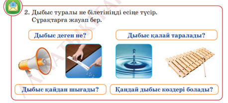 Дыбыс туралы не білеміз? -Дыбыс деген не? -Дыбыс қалай таралады? -Дыбыс қайдан шығады? -Қандай дыбыс көздері болады? Мына суреттегі дыбыс көздерін ажыратып көріңдер. -Бұдан қандай нәтиже шығарамыз? -Дыбыс екіге бөлінеді. Табиғи дыбыс көздері және жасанды дыбыс көздері. -Дыбыс деген не? Оны қалай көруге,сезуге болады?