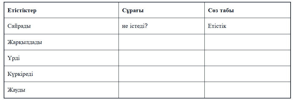 етістіктердің астын сызады.1 балл Саралау тапсырмасын орындайды 1 балл |