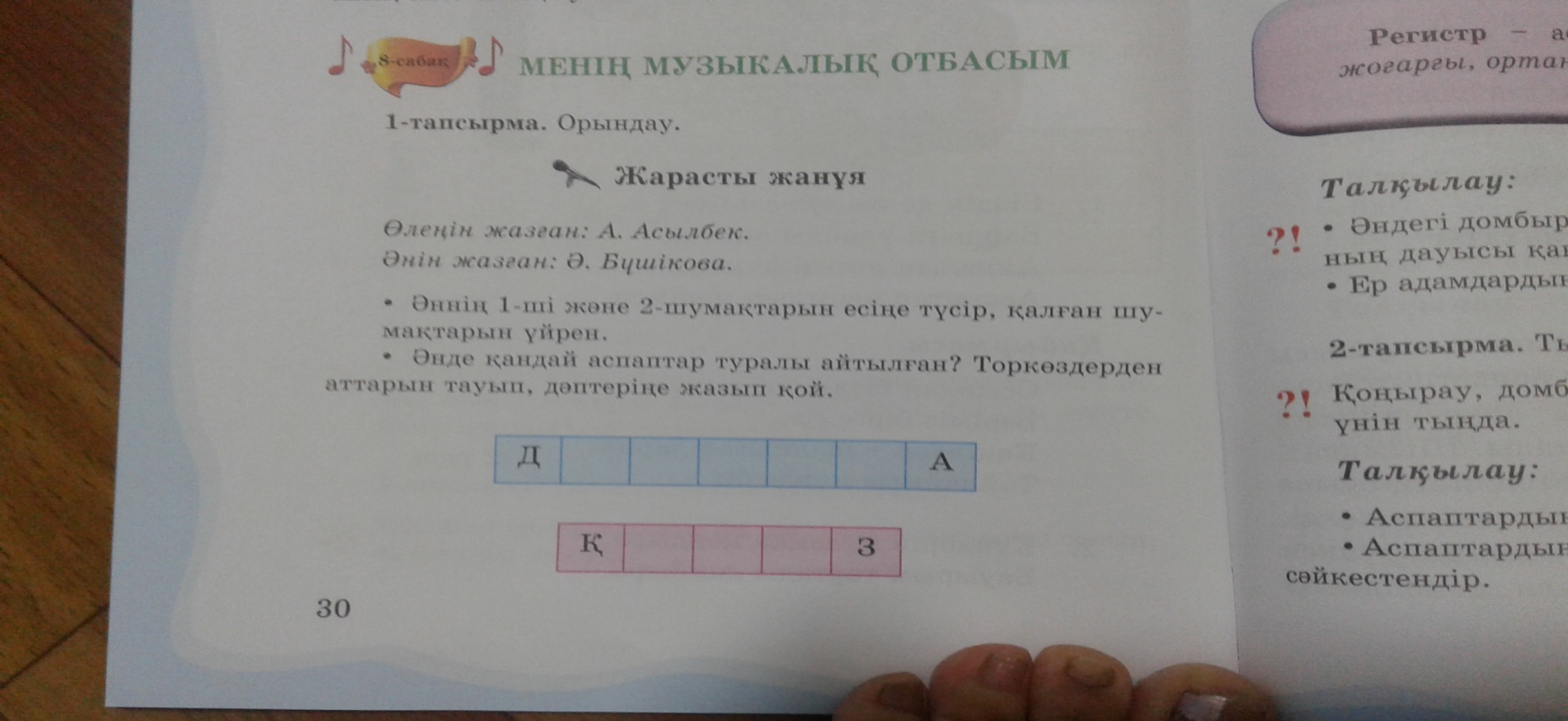 Білу және түсіну Оқушылар оқулықтағы негізгі тақырыппен танысады. Күй тартыс. «Сарыарқа» «Жариялау» әдісі (Әрбір топ берілген сұрақ бойынша өз позициясын жариялау керек. Бұл үшін топ ішінен спикер берілген уақыт ішінде (5 мину) басқа қатысушылар алдында сөйлеп, топ ұстанымын жеткізеді.)