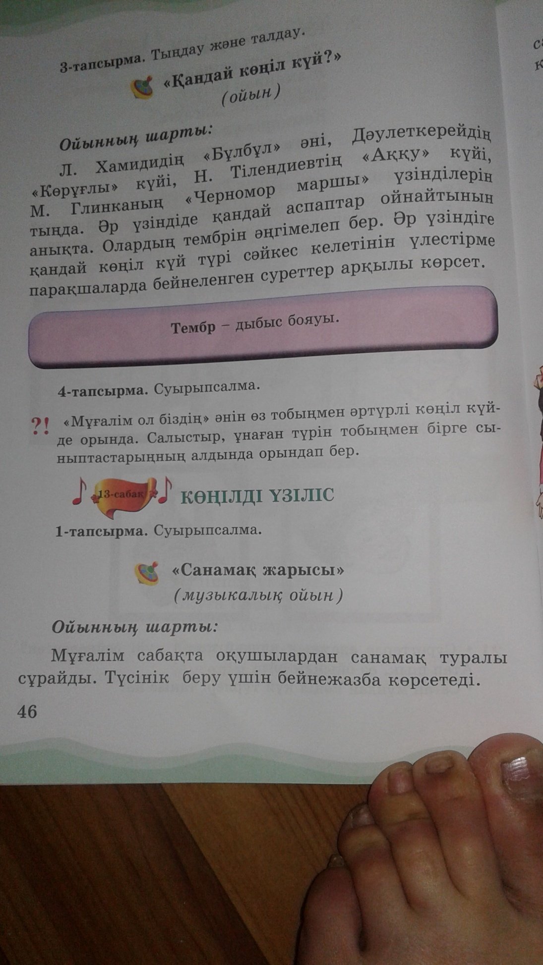 Білу және түсіну Оқушылар оқулықтағы негізгі тақырыппен танысады. Музыкадағы төлдер бейнесі «Сақина салмақ ойыны» Балалар біз бүгін сақина салмақ ойынын ойнаймыз. Бұл ойынның бүгіінгі ерекшелігі кімнің қолында сақина қалса менің сұрағыма жауап береді? |