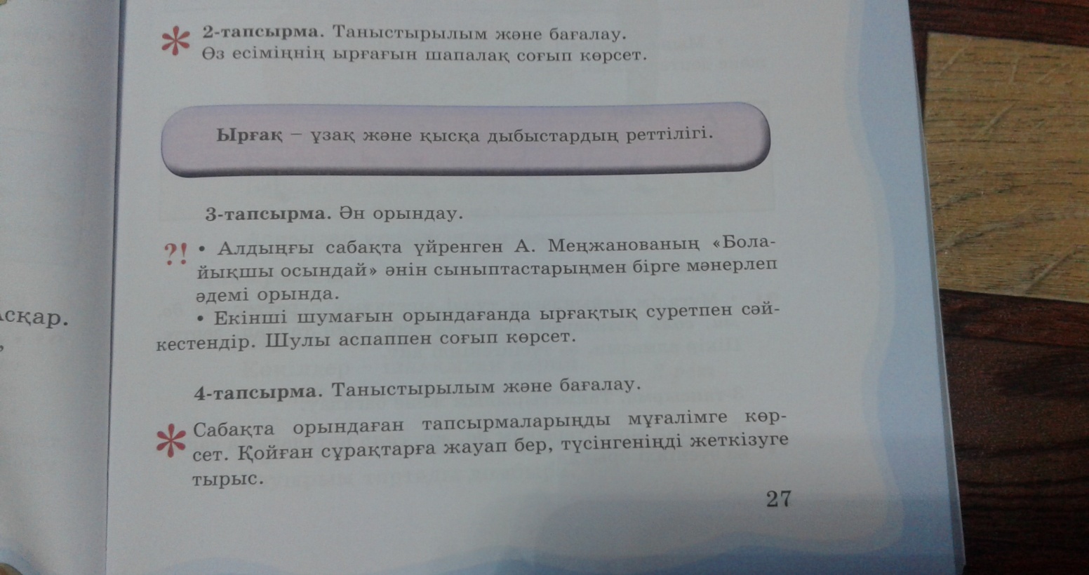 Қолдану Оқулықта берілген тапсырмаларды орындау. Түсіндіру. Топтық, жеке жұмыс жүргізу. Дәптермен жұмыс. 4-тапсырма. Орындау. Сыбызғы. |