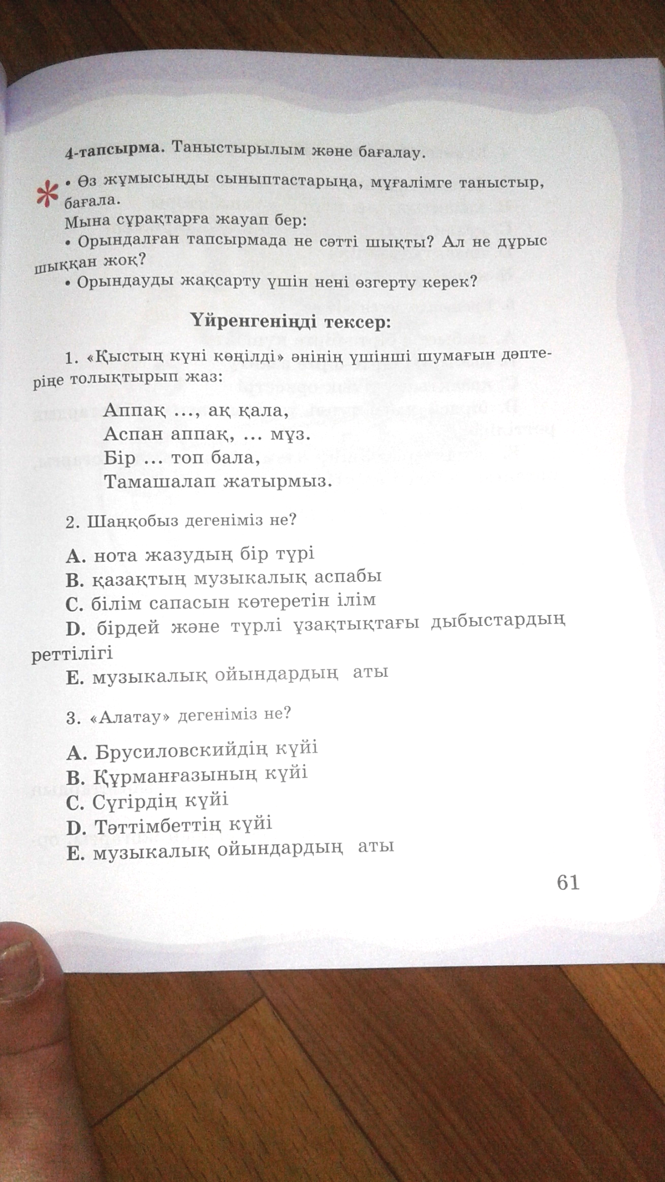 2.1.2 1- түрлі сипатты әндерді ән айту ережесін сақтапорындау; 2.1.2.2 -ансамбльде музыкалық аспаптардың көмегімен шығарманы қарапайым ырғақпенсүйемелдеп орындау |