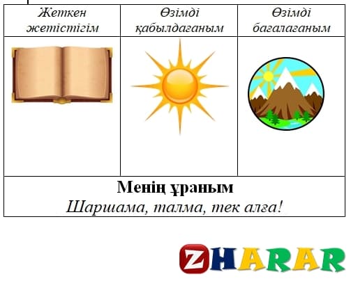 1.Сөздікпен жұмыс. Жаңа сөздермен таныстырады, оқушыларға қайталатады. Ойтүрткі Кім көп біледі?( Сөзжұмбақ шешу) ерекше тор көзден «Астана» сөзі шығады 1.Алматы қай таудың бауырайында орналасқан? 2.Астана қай өзеннің жағалауында орналасқан? 3.Биіктігі 97 метр болатын бас қаламыздың символы 4.Ең қымбат жан 5.Қазақстанның тұңғыш астанасы 6.Астананың бұрынғы астанасы қалай аталады? Оқылым 3- тапсырма Көп нүктенің орнына сөздерді қойып, толықтырып оқы. Тыңдалым. 1-тапсырма Тыңда. Сұрақтарға жауап бер. Біліп ал! Нені? Мен қаланы жақсы көремін. Мен Отанымды жақсы көремін. Сергіту сәті Айтылым 2- тапсырма Суреттерге қара. Сұрақтарға жауап бер. Жазылым 4-тапсырма Туған жерің туралы досыңа хат жаз. Қосымша тапсыпрма Топтық жұмыс Айтылым Айтылым Оқушы қажеттіктеріне қарай қолдау көрсетіп, қосымша түсіндіреді ЕББҚ (Зейін тапшылығы және гипербелсенділік синдромы (ЗТГС) жеке қолдау көрсетіледі |