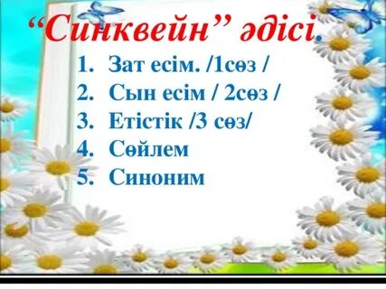 Айтылым Синквей формасы (француз тілінен аударғанда) 5 - өлең жолды өлең құрастыру. Тақырыбы: "Біздің сынып" 1 - жол - 1 сөз, зат есім немесе адамның аты 2 - жол - сипаттау - 2 сын есім 3 - жол - іс-әрекетті баяндау - 3 етістік 4 - жол - тақырыпқа сәйкес 4 сөз 5 - жол - қорынды 1 сөйлем |
