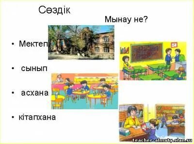 Тыңда. Сұраққа жауап бер. 2.Айтылым. 2-тапсырма Суреттерге қара. Бірнеше сөйлем құрап айт. Біліп ал! Бұл не? Бұл- асхана. Сергіту сәті Оқылым 3- тапсырма Оқы. Сұрақтар құра.Сұрақтарға жауап бер. Жазылым 4-тапсырма Айтылым Қосымша тапсырма Жазылым Оқушыларға мектепке қатысты сөздер айтуға еркіндік беріледі. Оқушы қажеттіктеріне қарай қолдау көрсетіп, қосымша түсіндіреді ЕББҚ (Зейін тапшылығы және гипербелсенділік синдромы (ЗТГС) жеке қолдау көрсетіледі Айтылым Iлулi тұр кең алаң, Керегiмдi мен одан. Жазып алам көшiрiп, Сүртем сосын өшiрiп. (Тақта) Төрт қырлы, өзi аппақ, Тақтадағы iзi аппақ. (Бор) Қабат - қабат қатталған, Асыл сөзбен апталған. Парағы бар сөйлейтiн, Ол қазына өлмейтiн. (Кiтап) Бiлiмнен мол сый-асы, Балғындардың ұясы. (Мектеп) Сағат сайын қағылады, Тек мектептен табылады. (Қоңырау) |