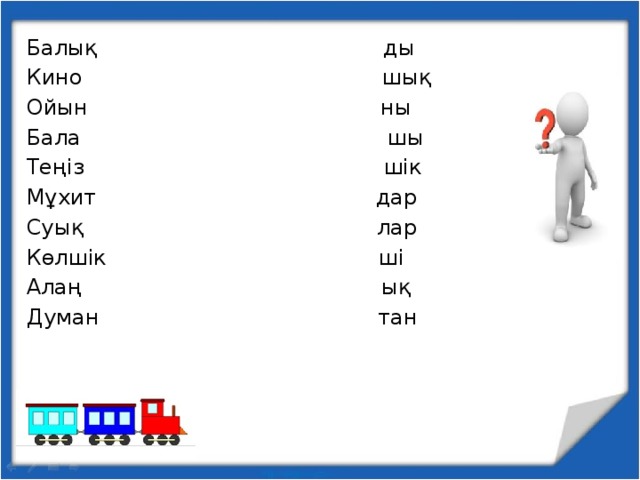 35-жаттығу «Адасқан буындар» ойыны Бұлттардағы буындар мен сөздерден жұмбақ құрастырып жаз. Шешуін тап Допты алып қолға, Дәл түсірген торға. Баскетболшы Үй тапсырмасы 34-жаттығу Қайсысы түбір,қайсысы қосымша екенін дәлелде Түбір қосымша Тау - дай Теңіз -ші Су -шы Үлкен -дер Жуан -дық ҚЖ: Тест тапсырмасы .