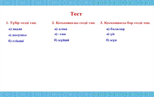 Дескриптор: Буындар мен сөздерден жұмбақ құрастырып жазып,шешуін табады-1б Дескриптор: Қайсысы түбір,қайсысы қосымша екенін дәлелдейді-1б