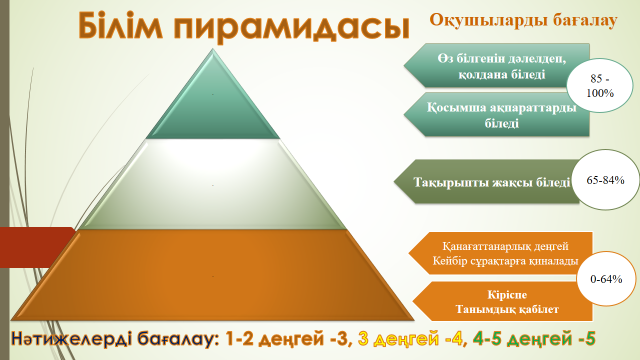 Мұғалім « Білім пирамидасы» бойынша оқушыларды бағалайды 85 -100% - 5 65-84% - 4 0-64% - 3 |
