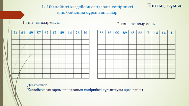 Мұғалім көрсетілім арқылы сұрыптау әрекетін көрсетеді Топтық жұмыс. 1- 100 дейінгі кездейсоқ сандарды көпіршікті әдіс бойынша сұрыптаңыздар