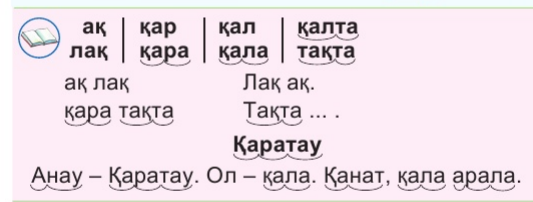 (Ұ) 4- тапсырмада «Сұрақ-жауап» әдісі қолданылады. «Сөз тану» айдары бойынша берілген жұмбақтың шешуін тап: Шік түсті,пүк түсті, Алшы түрды, тәйке тұрды. Шеш алады ал, кім мұны? (асық) ЕБҚ оқушыға: Ақмарал сөзіндегі қ дыбысының орнын анықта. ЕҚБ оқушы: Қ дыбысы бар сөздер атап, буынға бөл. ҚБ тапсырма: |